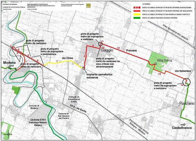 Il percorso ciclopedonale, che si colloca in parte su tratti già realizzati, inizia dal ponte ciclabile del Panaro, al confine tra i comuni di Modena in località Fossalta e Castelfranco Emilia e termina in via Sebenico, in corrispondenza della ciclabile porta a Panzano e poi al capoluogo comunale, attraverso Gaggio e Villa Sorra.