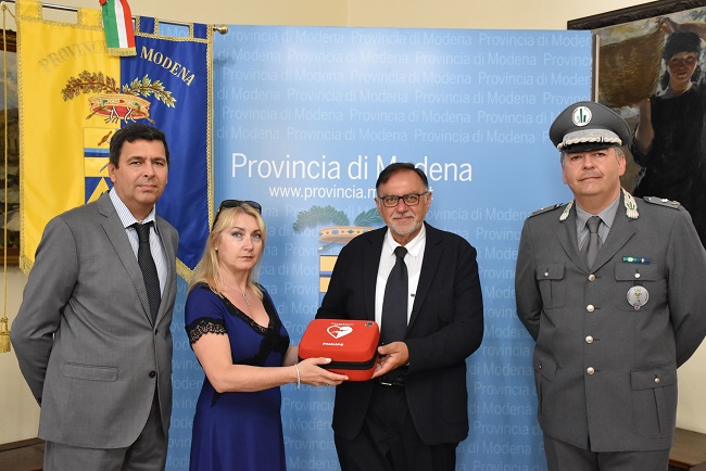 MODENA – Un dono per il cuore di tutti, che renderà la polizia provinciale sempre più vicina ai cittadini modenesi. Così il presidente della Provincia di Modena Gian Domenico Tomei ha commentato la donazione di un defibrillatore questa mattina, lunedì 18 luglio, da parte del prosciuttificio S.Francesco di Castelnuovo e che sarà impiegato dagli agenti della polizia provinciale, tutti già abilitati all’uso, nell’ambito del progetto “più vicini alla gente” che prevede, tra l’altro, l’organizzazione di un percorso specialistico in tema retraining blsd.