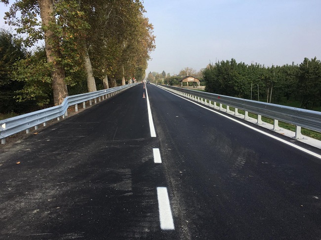 Con un investimento di due milioni e 352 mila euro, finanziati con risorse del Piano nazionale di sicurezza stradale e in parte dalla Provincia, sono stati installati nuovi guard-rail sui due lati lungo tutto il tratto per aumentare la sicurezza e proteggere gli automobilisti dal pericolo rappresentato dal canale Diamante e, sull’altro lato, dalla presenza di un filare di circa 50 platani; per installare le nuove barriere è stato realizzato un cordolo con oltre 325 pali di fondazione che ha consentito un sensibile allargamento della carreggiata.