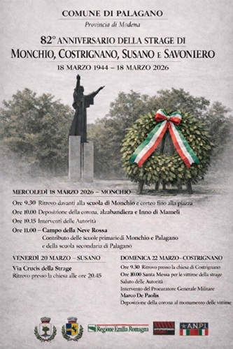 MODENA – A Monchio di Palagano mercoledì 18 marzo 2026 si terrà la commemorazione per l’82esimo anniversario della strage di Monchio, Costrignano, Susano e Savoniero, con la cerimonia civile e religiosa a ricordo delle 136 vittime dell’eccidio nazifascista del 18 marzo 1944.