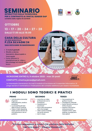 “SEMINARI INTERATTIVI GRATUITI sull’uso della Tecnologia per il Contrasto al Digital Gender Gap” è un progetto di rete promosso dall’Associazione di Promozione Sociale JANAS APS, in collaborazione e con il contributo delle Pari Opportunità e Politiche di Genere della Provincia di Rimini, e con il patrocinio del Comune di San Giovanni in Marignano.