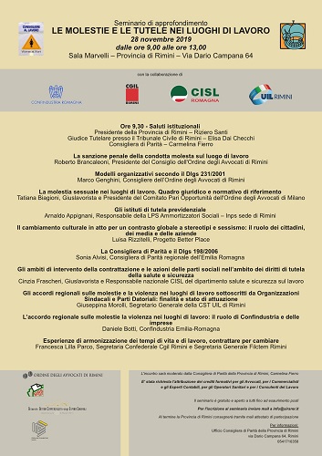 Giovedì 28 novembre con inizio alle ore 9.30, nella sala Marvelli della Provincia di Rimini, si svolgerà il seminario “Le molestie e le tutele nei luoghi di lavoro”
