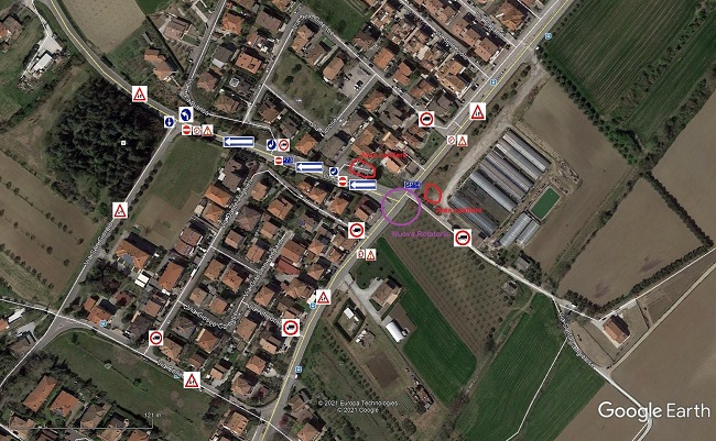 - Istituzione del senso unico alternato regolato da movieri o semaforo sulle SSPP 14 e 73 per 100 metri, a monte e a valle della rotatoria.
