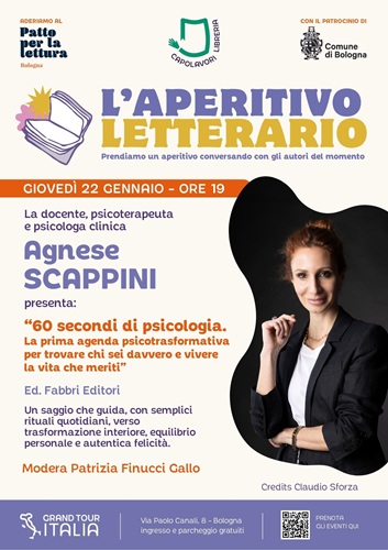 BOLOGNA – In un’epoca dominata dalla frenesia e dal burnout, è davvero possibile cambiare vita in soli 60 secondi al giorno? Secondo la scienza del benessere, la risposta è sì. Giovedì 22 gennaio alle ore 19:00, Grand Tour Italia ospiterà la Dott.ssa Agnese Scappini, psicologa clinica e psicoterapeuta, per la presentazione del suo nuovo libro “60 secondi di psicologia. La prima agenda psicotrasformativa” (Fabbri Editori).