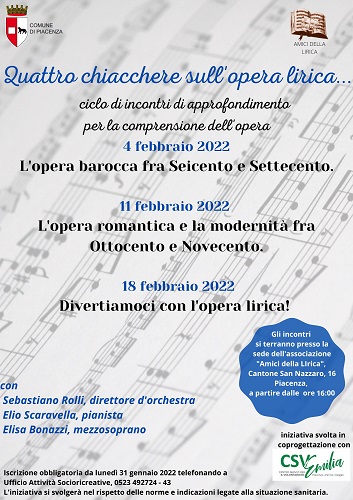 PIACENZA – Una nuova iniziativa gratuita arricchisce le proposte dell’Ufficio Attività Socio-ricreative del Comune di Piacenza a favore degli over 65 residenti in città. Inizierà infatti venerdì 4 febbraio un ciclo di incontri pomeridiani di approfondimento dedicati all’Opera lirica, organizzato grazie alla collaborazione tra Comune di Piacenza, CSV Emilia e l’associazione Amici della Lirica.