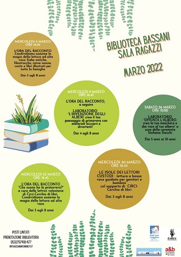 Mercoledì 2, 9 e 23 marzo 2022 alle 16.45, tre appuntamenti per condividere la magia della lettura ad alta voce, tra fiabe, filastrocche e libri illustrati per tutta la famiglia. Mercoledì 30 marzo alle 16,45, invece, appuntamento speciale dedicato alle letture a bassa voce con “Le isole dei lettori custodi”: le lettrici volontarie dell’associazione Circi-Cerchio di libri proporranno a bimbi e genitori “storie libere per cuori intelligenti”.