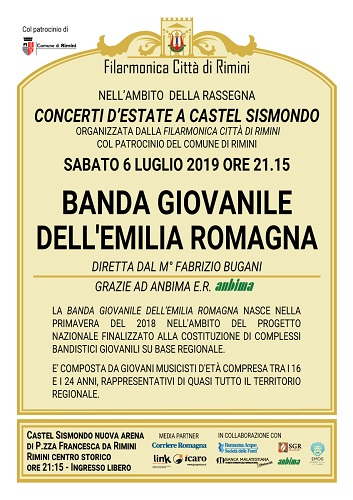 Si esibirà, diretta dal M° Fabrizio Bugani, la Banda Giovanile dell’Emilia Romagna. La Banda giovanile della nostra regione nasce nella primavera 2018 per iniziativa dell’Anbima ER. Ne fanno parte giovani musicisti, di età tra i 16 e i 24 anni, che rappresentano quasi tutto il territorio della regione, provenienti dalle bande di Busseto, Piacenza, Boretto, Concordia sul Secchia, Bologna, Castel San Pietro, Minerbio, Imola, Ravenna, Russi, Castel Del Rio, San Carlo Ferrarese. L’ambizione del progetto è quello di fornire ai giovani che intendono fare della musica la propria professione una opportunità di crescita culturale, formativa e professionale che implementi il loro portafoglio di competenze, oltre al voler creare momenti di incontro e confronto, musicale e sociale, tra giovani provenienti da realtà musicali e territoriali diverse. In particolare intende contribuire al raggiungimento di alcune finalità e obiettivi generali del Programma regionale dello spettacolo attraverso: