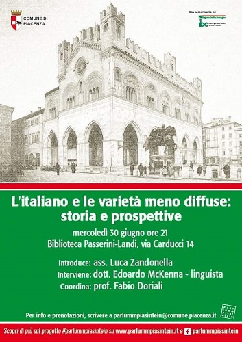 PIACENZA – Si tornerà a parlare di lingue d’Italia, nell’ambito del progetto comunale #parlummpiasintein, mercoledì 30 giugno alle 21 nel cortile della biblioteca Passerini-Landi di via Carducci 14. Ospite dell’incontro, dal titolo “L’italiano e le varietà meno diffuse: storia e prospettive”, sarà il linguista Edoardo McKenna.