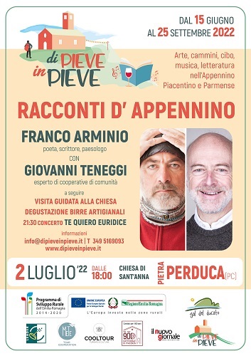 TRAVO (PC) – Sabato 2 luglio, alle ore 18.00, presso la suggestiva cornice della Pietra Perduca, si apre una serata di poesia, dialoghi, arte, gusto e musica. Ospiti il poeta e scrittore FRANCO ARMINIO insieme a GIOVANNI TENEGGI, esperto di cooperative di comunità, che daranno vita ad un incontro tra due anime “appenniniche”, una conversazione che sarà punto di congiunzione tra Nord e Sud, in un racconto sulla dorsale montuosa che narra e svela una storia comune.