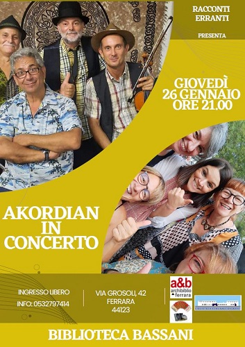 FERRARA – Saranno gli ‘Akordian’ con le loro sonorità klezmer i protagonisti, giovedì 26 gennaio 2023 alle 21, del nuovo appuntamento con la rassegna ‘Racconti erranti’ alla biblioteca comunale Bassani di via Grosoli 42 (zona Barco, Ferrara).