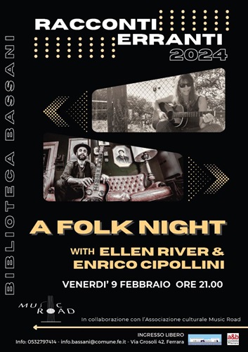 FERRARA – Serata folk venerdì 9 febbraio 2024 alle 21 alla biblioteca comunale Bassani (via Grosoli 42, Barco – Ferrara), per il nuovo appuntamento con la rassegna “Racconti Erranti”, in collaborazione con l’associazione culturale Music Road. Protagonisti saranno i cantautori Ellen River ed Enrico Cipollini.