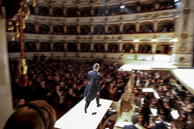 Una foto di Marco Caselli Nirmal, tratta dall’archivio del Teatro Comunale, immortala Claudio Abbado durante quell’allestimento. “Un’istantanea spiazzante – come si leggeva nella didascalia della mostra Tra due fuochi allestita nel 2020 in Rotonda Foschini – dove per un attimo l’osservatore sembra non trovare il fuoco. Poi d’improvviso il fuoco si trova, potentissimo, nel passo teso e carico d’energia di Claudio Abbado che saluta il pubblico al termine di un’esecuzione trascinante dell’opera mozartiana”.