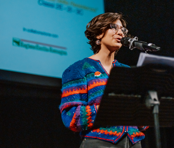 La seconda fase si è sviluppata attraverso due incontri/laboratori teatrali condotti dall’associazione ‘Trame, Teatro e Musica’, durante i quali gli studenti hanno preso parte a giochi, esercizi corali di gruppo e alla rielaborazione di storie legate ai temi della cittadinanza globale, del consumo consapevole, dell’ambiente e della solidarietà. Un percorso creativo ed esperienziale che ha favorito l’ascolto reciproco, la collaborazione e l’espressione personale e che si è, in seguito, sviluppato attraverso la creazione di video, podcast e testi collettivi presentati durante l’evento conclusivo.