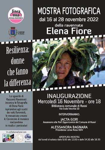 RUSSI (RA) – Mercoledì 16 novembre 2022, alle ore 18.00, presso la Biblioteca comunale di Russi (via Godo Vecchia 10) si terrà l’inaugurazione della mostra “Resilienza: donne che fanno la differenza”, curata da Linea Rosa in collaborazione il Comune di Russi, CNA Ravenna, il Collettivo “Racconti Ravennati” e Hobby Foto Club Ravenna. La mostra prevede l’esposizione delle fotografie della ravennate Elena Fiore, già comandante della Polizia Locale e da sempre interessata di fotografia, che dialogheranno con le Coroncine di mosaico create dalle mosaiciste del Collettivo “Racconti Ravennati”, ispirate agli scatti dei volti femminili di Elena per risaltarne i particolari.