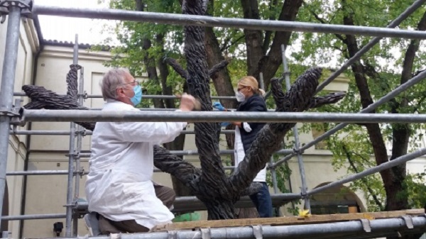 Nella foto il restauro di un’opera di Ivo Sassi collocata nel giardino del MIC Faenza