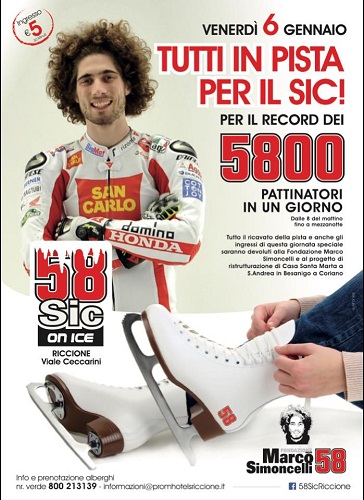 RICCIONE (RN) – Il giorno della Befana sulla pista di ghiaccio 58SIC On Ice dedicata a Marco Simoncelli si tenterà di raggiungere il record di 5.800 pattinatori per ricordare il magico numero 58 con cui correva l’indimenticabile e amatissimo pilota di Coriano.