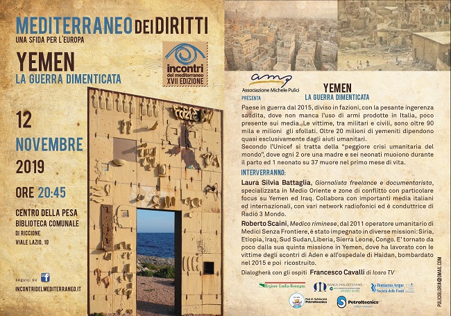 RICCIONE (RN) – Gli Incontri del Mediterraneo, a conclusione della XVII edizione 2019, propone una serata di informazione e di riflessione su una guerra di cui si parla molto poco. La guerra in corso, dal 2015, nello Yemen. Dove non mancano le ingerenze straniere, compreso l’impiego di armi vendute dall’Italia e da altri paesi europei.