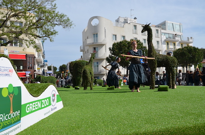 Danzatrici Masai e altissime giraffe mosse da abili trampolieri, hanno ballato su musiche tribali africane creando una spettacolare coreografia per accompagnare il taglio del nastro del Green Zoo, che ospita installazioni vegetali in siepe scolpite a forma di giraffe ed elefanti.