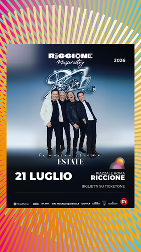 60 anni di storia, musica ed emozioni e oltre 100 milioni di copie vendute in tutto il mondo. Il sessantesimo anniversario dei Pooh si conferma uno degli eventi musicali più attesi e celebrati di sempre: una band che continua a scrivere la storia e un successo che non conosce pause. Dopo l’annuncio del grande ritorno live nei palasport italiani e dei due eventi all’Arena di Verona, il racconto dei Pooh si arricchisce di un nuovo e importante capitolo: “Pooh 60 – La nostra storia – Estate”, il tour che porterà la grande celebrazione della band nelle più suggestive location all’aperto: il 21 luglio l’appuntamento sarà in piazzale Roma a Riccione. Un viaggio straordinario che continua a emozionare e a rinnovarsi, trasformando ogni concerto in un evento unico e irripetibile. Un’estate di musica, ricordi e condivisione, pensata per vivere dal vivo una storia che attraversa generazioni, che ha segnato la colonna sonora di milioni di persone e che, a sessant’anni dal primo passo, continua a stupire, coinvolgere e unire il pubblico.