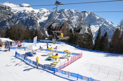 Grazie alla preziosa collaborazione della Cooperativa Bagnini che ha messo a disposizione un pattino, sei brandine e tre ombrelloni e l’eccezionale disponibilità di Funivie Folgarida Marilleva Spa, è stato possibile realizzare una strategica operazione di co-marketing che vede protagonista la città di Riccione attraverso un’area completamente brandizzata e interamente dedicata ad info point collocata a pochi passi dalla seggiovia, all’interno del ‘Family Park’ con animazione per tutti i bambini. Durante il periodo pasquale Funivie Folgarida Marilleva Spa prevede che transitino all’interno dell’area Family Park circa 70.000 persone.