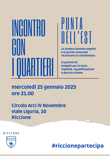 RICCIONE (RN) – Proseguono gli incontri tra amministrazione comunale di Riccione e cittadini. Mercoledì 25 gennaio alle 21 nel Circolo Arci di IV Novembre la sindaca Daniela Angelini e la giunta comunale incontreranno gli abitanti della zona Punta dell’Est.