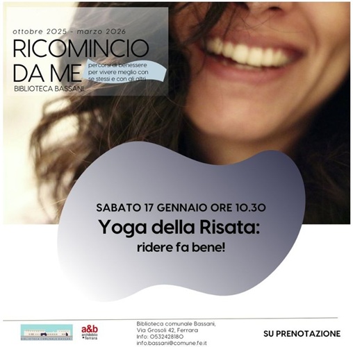 FERRARA – Sarà dedicato allo Yoga della Risata, disciplina che unisce esercizi di risata indotta e tecniche di respirazione profonda, il nuovo appuntamento, sabato 17 gennaio 2026 alle 10:30, con la rassegna “Ricomincio da me” alla biblioteca comunale Bassani (via Grosoli 42, Ferrara). L’incontro sarà curato da Rosa Marra, leader e teacher certificata di Yoga della Risata.
