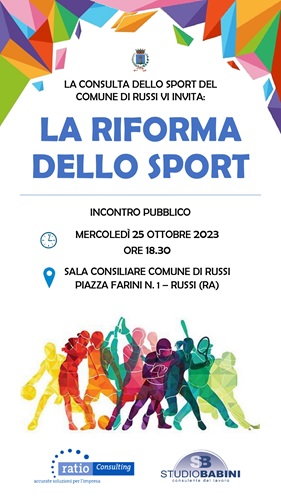 Per approfondire questo tema, la Consulta dello Sport di Russi, in collaborazione con Ratio Consulting e Studio Babini, organizzano un incontro pubblico rivolto ai rappresentanti delle Società sportive di Russi e non, che si terrà mercoledì 25 ottobre, alle ore 18.30, nella sala consiliare del Comune di Russi, in Piazza Farini 1.