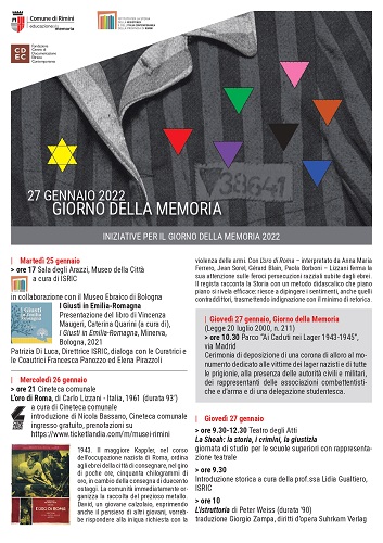 Il ricco programma degli eventi previsti per il Giorno della Memoria inizia nel pomeriggio di martedì 25 alle ore 17 nella sala Sala degli Arazzi al Museo della Città – con la presentazione del libro “I Giusti in Emilia-Romagna” di Vincenza Maugeri, a cura di Caterina Quarini. Un evento seguito dall’Istituto Storico della Resistenza di Rimini, in collaborazione con il Museo Ebraico di Bologna. Mercoledì 26 gennaio alle ore 21 in Cineteca comunale verrà proiettato il film “L’oro di Roma”, di Carlo Lizzani.