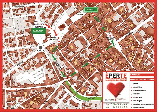 La Camminata partirà alle 15.30 dalla Piazza Francesca da Rimini (di fianco al Castello Malatestiano) il giorno sabato 23 novembre 2019. La partenza è prevista per le ore 16:00, il corteo attraverserà il centro storico, passando per: Via Bastioni Occidentali ; Via Garibaldi ; Piazza Tre Martiri, Corso D’Augusto; Arrivo in Piazza Cavour previsto per le 17.00 circa. Alle ore 17.00/17.15 dalle scale del Palazzo dell’Arengo ci saranno i saluti dei rappresentanti di Provincia, Comune e Centro antiviolenza Rompi il silenzio. Seguirà il Dj set di Marta Musicanta .