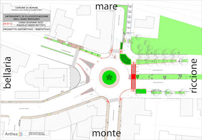 La nuova rotatoria avrà un diametro di 34 metri, con la corsia di transito di 8, un anello sormontabile pavimentato in cubetti di pietra tipo selce del Marecchia di 2 e un’aiuola centrale con arredo verde del diametro di circa 7 metri.