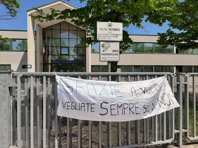 RIMINI – “Grazie a voi che vegliate sempre su di noi”, è la scritta disegnata su un lenzuolo bianco che gli agenti della Polizia Locale si sono trovati affisso sulla recinzione del Comando in via della Gazzella. Un chiaro gesto di solidarietà di qualche riminese che ha riconosciuto il difficile lavoro profuso da tutti gli agenti impegnati in queste settimane di emergenza sanitari.