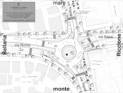 L’intersezione tra via Roma – via Tripoli – via Ugo Bassi, attualmente regolata da un impianto semaforico, è uno degli incroci storici della città tra due strade (Tripoli e Roma) che per la loro posizione e dimensione hanno acquisito una importanza fondamentale nel collegamento mare e monte e nord – sud. Lo scopo del progetto è quindi quello di snellire e fluidificare, attraverso la realizzazione di una rotatoria uno degli incroci strategici della circolazione dell’asse mediano e della città.