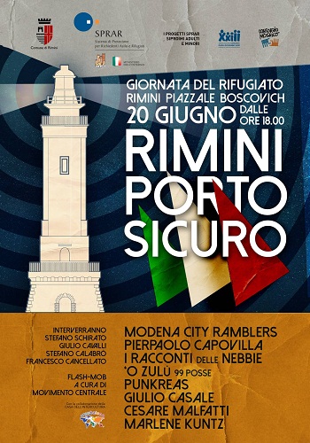 Il mare, simbolo della speranza oltre l’orizzonte, e la musica, veicolo di comunicazione capace meglio di altri di abbattere muri e differenze. Mare e musica sono l’essenza di Rimini porto sicuro la manifestazione organizzata dal Comune di Rimini con l’associazione Arcobaleno in programma giovedì 20 giugno e che prevede dalle 18 a tarda sera un ricco programma segnato dalla presenza di alcuni importanti artisti italiani, che si ritroveranno a Rimini uniti per affrontare grazie all’arte e alle canzoni uno dei tempi salienti del nostro tempo: il viaggio dei migranti. L’iniziativa nasce infatti in occasione della “Giornata internazionale del rifugiato”, indetta dalle Nazioni Unite per commemorare l’approvazione nel 1951 della Convenzione relativa allo statuto dei rifugiati e per sensibilizzare l’opinione pubblica.