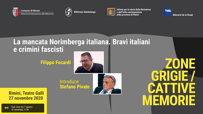 RIMINI – Si svolgerà venerdì 27 novembre alle ore 17.30, in modalità webinar, il secondo importante appuntamento del ciclo di conferenze dal titolo “Zone grigie/Cattive memorie”. La partecipazione a questa seconda sessione educativa sulla memoria del nazismo e del fascismo, avverrà esclusivamente in forma remota, tramite una connessione a internet, nel pieno rispetto delle indicazioni previste dagli ultimi DPCM che hanno vietato la possibilità di svolgere conferenze in presenza.