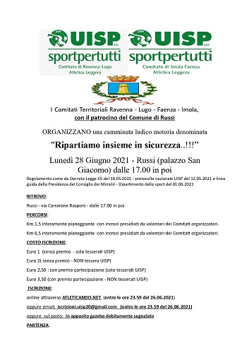 RUSSI (RA) – I Comitati Territoriali di Ravenna, Lugo, Faenza e Imola, con il patrocino del Comune di Russi, organizzano per lunedì 28 giugno una camminata ludico motoria denominata “Ripartiamo insieme in sicurezza!”, con ritrovo a Palazzo San Giacomo (via Carrarone Rasponi) alle ore 17.