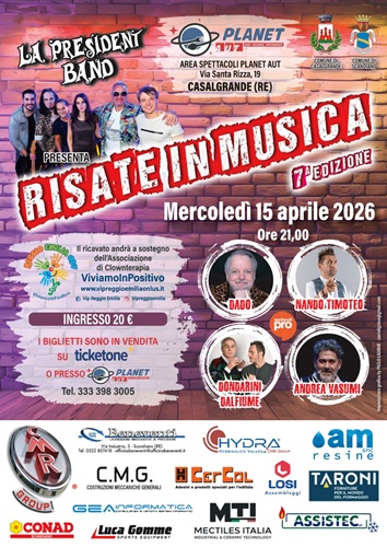 Un cast di comici di livello nazionale, musica, intrattenimento e tanto cuore. Sono questi gli ingredienti di “Risate in Musica”, lo show che andrà in scena mercoledì 15 aprile, alle ore 21, presso l’Area Spettacoli di Planet Aut a Casalgrande (via Santa Rizza 19), a Reggio Emilia, il cui ricavato sarà devoluto all’associazione di clownterapia “Viviamo in positivo” di Reggio Emilia (www.vipreggioemiliaonlus.it).