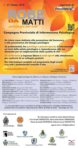 BOLOGNA – Offrire informazioni accurate sulla figura e la professionalità dello psicologo e dello psicoterapeuta, correggere false credenze sulla salute e sulle malattie mentali e rendere noti tutti gli ambiti di applicazione della Psicologia. Sono gli scopi della rassegna «Robe da Matti – Psicologia per tutti», giunta alla seconda edizione, che proseguirà a Bologna e provincia per tutto il mese di ottobre. Una campagna d’informazione e prevenzione del disagio psicologico, organizzata dall’Associazione di Promozione Sociale Psicosfere, con il patrocinio dei Comuni di Bologna, Anzola dell’Emilia, Casalecchio di Reno, Castel San Pietro Terme, Molinella, San Giovanni in Persiceto, San Giorgio di Piano e San Lazzaro di Savena. Fino al 31 ottobre 2018, 23 psicologi e psicoterapeuti aderenti al progetto e presenti sul territorio bolognese, mettono la loro esperienza e le loro conoscenze a disposizione dei cittadini, attraverso 45 conferenze e seminari aperti a tutti incentrati su tematiche di grande attualità quali bullismo, nuove genitorialità, benessere di coppia, lutto, ansia e panico, oltre a colloqui individuali gratuiti su prenotazione. L’obiettivo è di facilitare al grande pubblico l’incontro con lo psicologo, mettendo in rete tutte le conoscenze, le persone e le risorse necessarie. La prevenzione psicologica è infatti un processo fondamentale per la comunità perché permette di aiutare le persone ad essere più informate e a cercare la loro realizzazione come individui nei vari contesti di vita: nella coppia, nella famiglia, nella professione e nella società. Partecipano all’iniziativa l’Associazione M.Ed.I.Azioni, LINFA (Servizi per l’infanzia, l’adolescenza e la famiglia) e la Casa della Conoscenza – entrambe di Casalecchio di Reno –, l’Istituzione Biblioteche di Bologna, la Mediateca di San Lazzaro di Savena e Fermo Immagine (Punto di Documentazione e Formazione) del Quartiere Savena. Per consultare il programma degli eventi e l’elenco dei professionisti aderenti, con i quali prenotare un colloquio gratuito, basta consultare il sito www.psicosfere.it e contattare direttamente lo specialista scelto. Per altre info: dott.ssa Maria Letizia Rotolo 3286852606; info@psicosfere.it.
