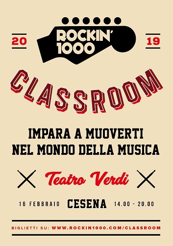 Per la prima volta (questa è la quarta reunion ufficiale a Cesena) Rockin’1000 ha inizio nel pomeriggio con Rockin’1000 ClassRoom: 6 ore di full immersion a 360 gradi con artisti e grandi professionisti del mondo musica, che condivideranno esperienze, processi, retroscena, condividendo consigli su come promuoversi e crescere come musicisti.