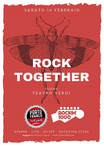 CESENA – Dall’incontro tra Rockin’1000 Night Live e Portofranco Rock Party nasce Rock Together, la quarta reunion annuale della community rock più grande del mondo: sabato 16 febbraio presso il Teatro Verdi di Cesena (dalle 21 – via Luigi Sostegni 13/a). L’evento serale – realizzato da Rockin’1000 in collaborazione con Portofranco – è anticipato dal pomeriggio dedicato alla formazione con Rockin’1000 ClassRoom, ciclo di moduli formativi pensati per imparare a muoversi nel mondo della musica (dalle 14 alle 20 – Teatro Verdi, iscrizioni sul sito: www.rockin1000.com/it/classroom.php).