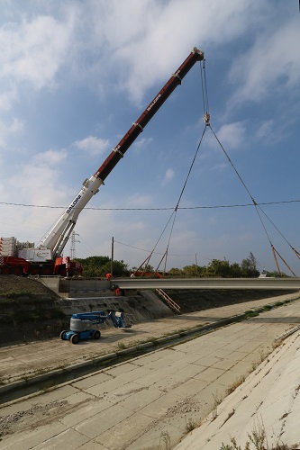 RIMINI – Una dopo l’altra, con un’operazione spettacolare seguita da un certo pubblico, hanno iniziato ad essere poste in posizione le otto travi in cemento armato che, lunghe 30 metri circa e dal peso che sfiora le 50 tonnellate, sosterranno il nuovo ponte sul fiume Ausa destinato a collegare le due rotatorie previste dall’intervento in corso sulla SS 16 in prossimità dello stabilimento Valentini, una sulla SS16 e una su via Aldo Moro, già conclusa e attiva dall’agosto scorso.