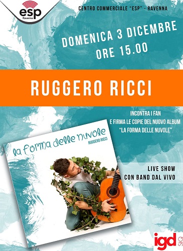 RAVENNA – Ruggero Ricci incontrerà la stampa e i suoi fans allo showcase di Domenica 3 dicembre 2017 al Centro Commerciale ESP di Ravenna. Inizio previsto alle ore 15.30 con la conferenza stampa, la distribuzione del CD e firmacopie. Subito dopo Ruggero Ricci in anteprima nazionale, accompagnato dalla sua band, in concerto live di presentazione del suo album.