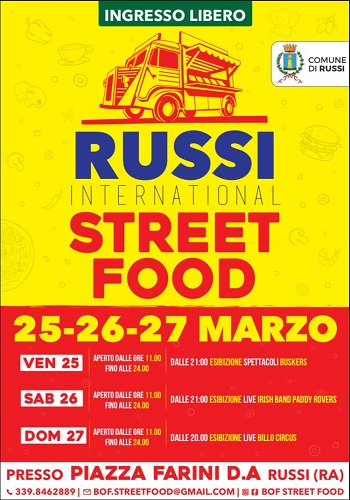 RUSSI (RA) – Da venerdì 25 marzo a domenica 27 marzo, in piazza Domenico Antonio Farini a Russi sarà possibile gustare le prelibatezze della tradizione gastronomica di strada italiana ed estera, preparate sul momento da coloratissimi camioncini, vere e proprie cucine itineranti.