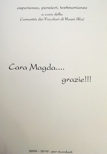 In occasione di tale incontro, Gabriella Lombardi, già collega di Magda Fabbri, presenterà il libro “Cara Magda… grazie!!!”, curato dalla locale comunità dei Focolari. All’incontro interverranno il Sindaco di Russi Valentina Palli, il parroco don Pietro Scalini e il presidente di “Porta Nova” Daniele Bolognesi. Porteranno infine la loro testimonianza: Donata Utili, Maria Giovanna De Pasquale e Verter Barnabè.