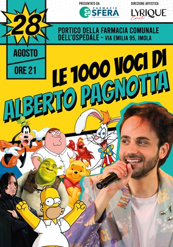 Giovedì 28 agosto, alle 21 con ingresso libero e gratuito, il porticato della Farmacia Comunale dell’Ospedale di Imola al civico 95 di via Emilia si trasformerà nel palcoscenico ideale per ospitare lo spettacolo ‘Le mille voci’ di Alberto Pagnotta. Attore, doppiatore e performer tra i più versatili del panorama italiano, reduce dal grande successo del programma LOL Talent Show di Amazon Prime, Pagnotta porterà in scena dal vivo le voci di alcuni dei personaggi più amati del cinema e della televisione. Da Homer Simpson a Severus Piton, da Goofy a Peter Griffin, da Roger Rabbit a Mike Wazowski. Un’esperienza unica in cui la magia del doppiaggio prenderà vita davanti al pubblico tra risate, sorprese e un pizzico di nostalgia.