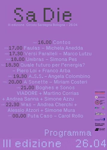BOLOGNA – Sabato 26 aprile il Circolo Sardegna organizza la terza edizione di Sa Die, un’iniziativa che si svolgerà negli spazi della Casa Quartiere Saffi per celebrare la ricorrenza della “Sarda Rivoluzione” a cavallo tra Bologna e Sardegna: due realtà distanti, che si avvicinano tramite le relazioni fra le persone che le abitano.