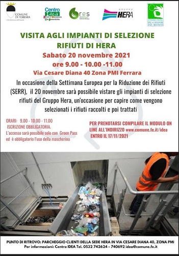 FERRARA – Sabato 20 novembre, con tre turni di visita, alle ore 9 – 10 e 11, i cittadini, accompagnati da personale del Gruppo Hera che illustrerà le varie fasi del processo, potranno accedere all’impianto di selezione e recupero rifiuti e al termovalorizzatore di HERAmbiente (via C. Diana 40 a Ferrara) e vedere direttamente dove confluiscono i rifiuti raccolti nel nostro Comune, come vengono gestiti e come funziona un impianto di selezione.