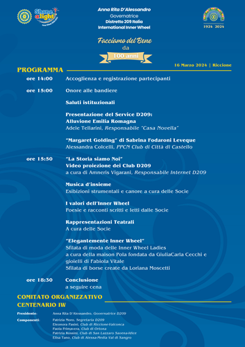 Inner Wheel, organizzazione internazionale di service, festeggia i 100 anni dalla sua fondazione, e in questa importante occasione, il Distretto 209 di Innner Wheel Italia, che comprende le regioni Emilia-Romagna, Toscana, Marche, Umbria, Abruzzo e Molise (per un totale complessivo di quarantuno Club con mille socie iscritte), organizza un grande evento aperto al pubblico e a scopo benefico.