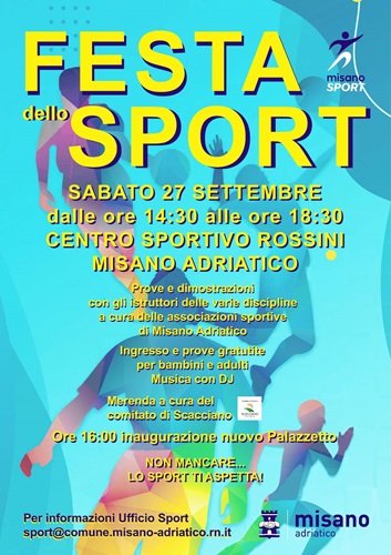 MISANO ADRIATICO (RN) – Lo sport continua ad essere il filo conduttore del mese di settembre a Misano Adriatico. Sabato, dalle 14:30 alle 18:30, nel centro sportivo Rossini tornerà l’appuntamento con la Festa dello Sport, l’evento che mette in vetrina l’attività delle associazioni sportive misanesi.