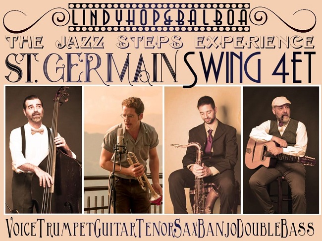 Saint Germain swing quartet con Davide Veronese alla tromba e voce, Marco Putinato ai sassofoni, Andrea Boschetti alla chitarra e Beppe Pilotto al contrabbasso, Un progetto nato per celebrare l’energia del jazz acustico del periodo “hot”, nato nei bassifondi di Harlem e diventato à la page nei bistrot parigini, per rendere omaggio a una preziosa forma d’arte che, assieme a letteratura e cinema, ha contribuito alla riconquista della libertà negata nell’era dei grandi conflitti mondiali. La musica della Parigi anni 50. Dal Ducato di Ellington ai Reami di Django un itinerario a bordo di battelli sulla Senna, carrozze dell’Orient Express e aerostati spinti dalle note che hanno accompagnato gli anni più turbolenti roboanti, innovativi e controversi del secolo scorso.