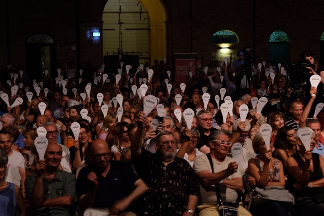 Il verdetto del Processo viene emesso dal pubblico presente munito di paletta. L’organizzazione è di Sammauroindustria.